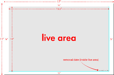 Include instructions for date of removal in the lower right corner of the live area. This date should either be the date of the event (if applicable) or a date three (3) months from the date of printing.